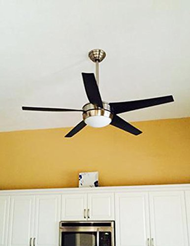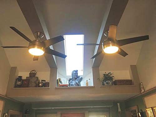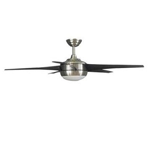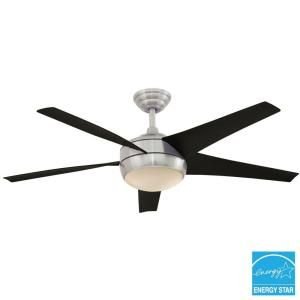 The patented High-Efficiency Blade System of the Home Decorators Collection 52 in. Brushed Nickel Windward IV saves up to 75% more energy, and moves up to 40% more airflow than standard fans while allowing for ultra-quiet, wobble-free operation. This simple, yet contemporary design has an integrated light kit with frosted opal glass bowl and includes two 13-Watt GU24 bulbs. The fan's 29° steeper blade pitch provides greater air movement, and features a three-speed reverse function for year-round comfort and savings. The thermostatic remote with LCD screen controls the speed of your ceiling fan (high, medium, low) and the light. The remote includes a programmable feature that allows the fan to automatically turn on and off when the room reaches a desired temperature. This Energy Star rated, Eco Option ceiling fan has less of an impact on the environment than comparable standard ceiling fans. Specifications Dimensions Assembled Depth (in.): 52 in Assembled Height (in.): 16.5 in Assembled Width (in.): 52 in Ceiling Fan Width (in.): 52 Downrod Length (in.): 6 Fan Blade Length (In.): 22.8 Fan Blade Width (In.): 5.3 Details Airflow (CFM): 6112 Blade Color Family: Silver Bulb wattage (watts): 13 Color Family: Nickel Commercial / Residential: Residential Damp/Wet Rating: Dry Downrod Included: Yes Dual Fan Heads: No Fan Blade Material: Acrylonitrile Butadiene Styrene (ABS) Features: Reversible Motor Fixture Color/Finish: Brushed Nickel Glass Style: Frosted Housing Color Family: Nickel Included: Angle Mount Hardware, Downrod, Hardware, Light Kit, Remote Control Indoor/Outdoor: Indoor Light Bulb Type Included: CFL Light Type: Integrated Motor Speed (RPM): 170 Mounting Options: Angled, Flush, Standard Number of Blades: 5 Number of Speeds: 3 Product Weight (lb.): 20.2lb Pull Chain: No Remote Control: Yes Reverse Airflow: Yes Reversible Two-Sided Blades: No Timer: No Certifications and Listings: 1-UL ListedFeature