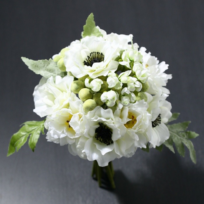 순백의 피오니에 아이보리×블랙의 포피를 믹스 한 트렌드의 어레인지 부케입니다.