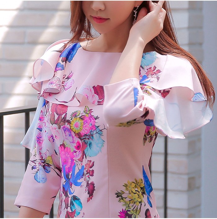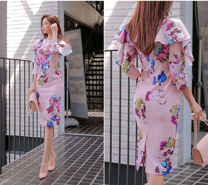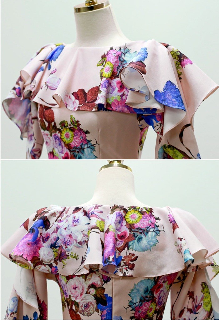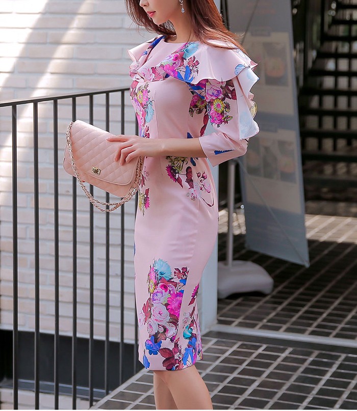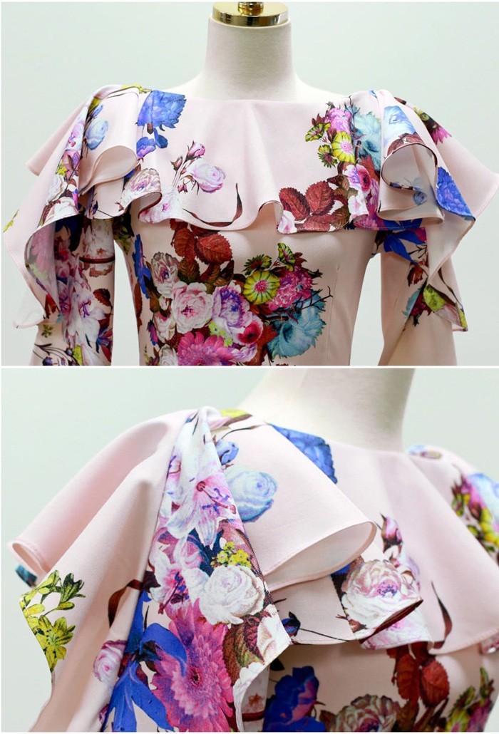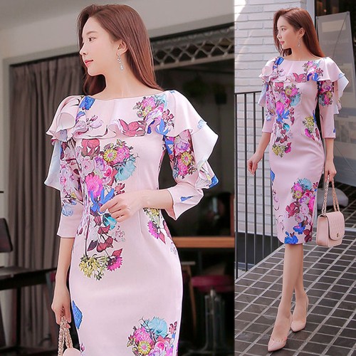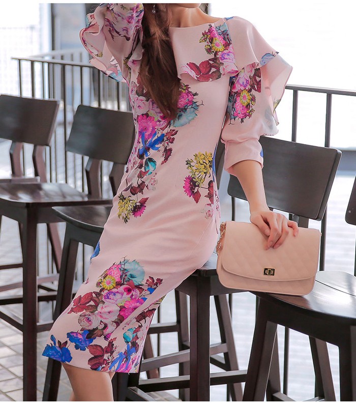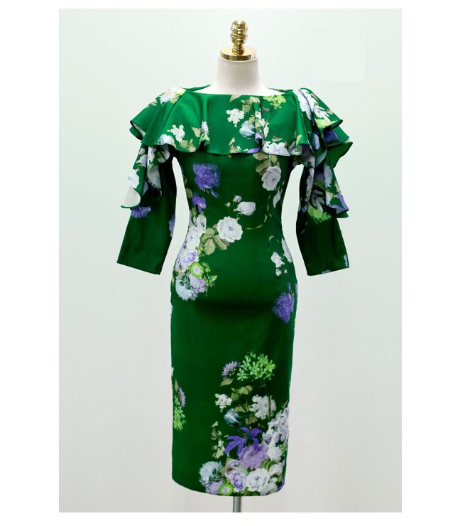 商品名:ワンピース フリル 花柄 フラワー 膝丈 きれいめ