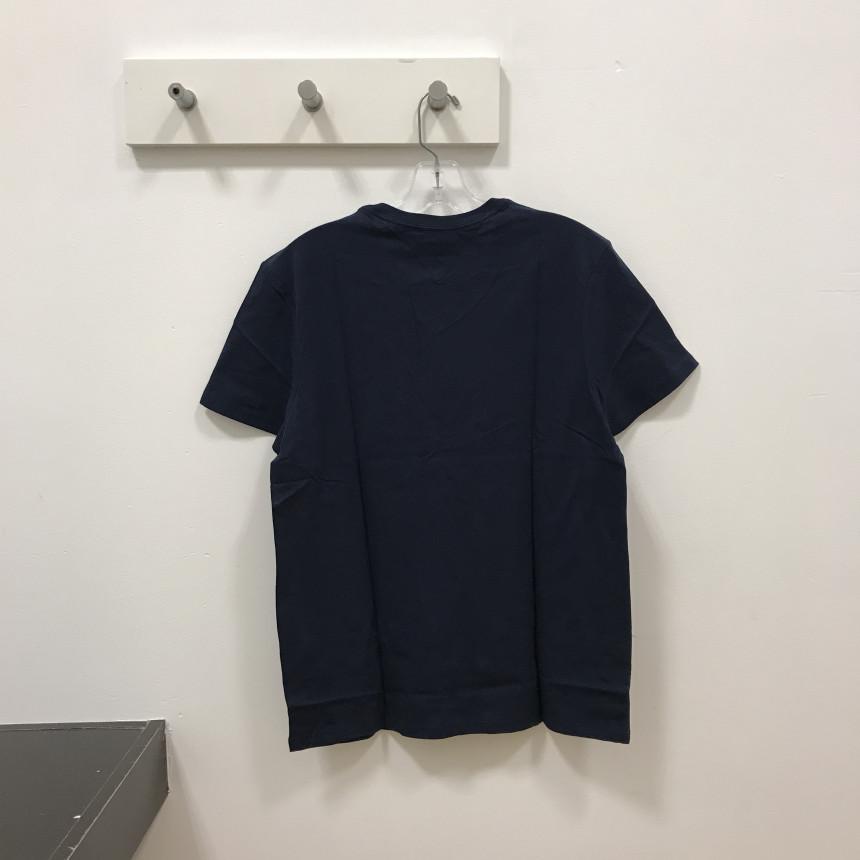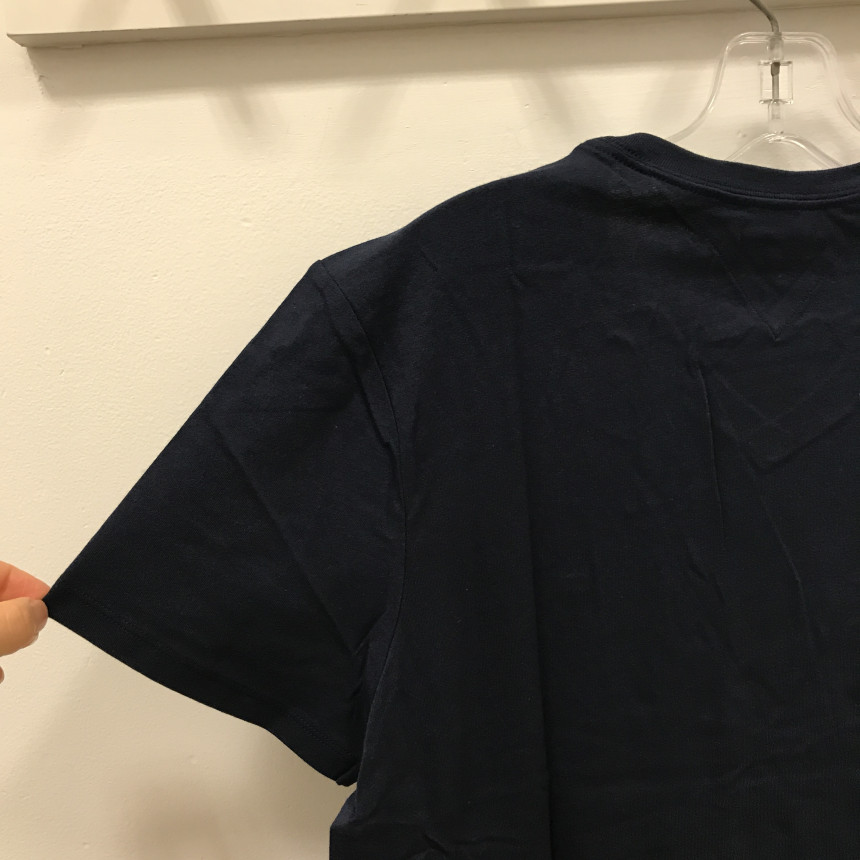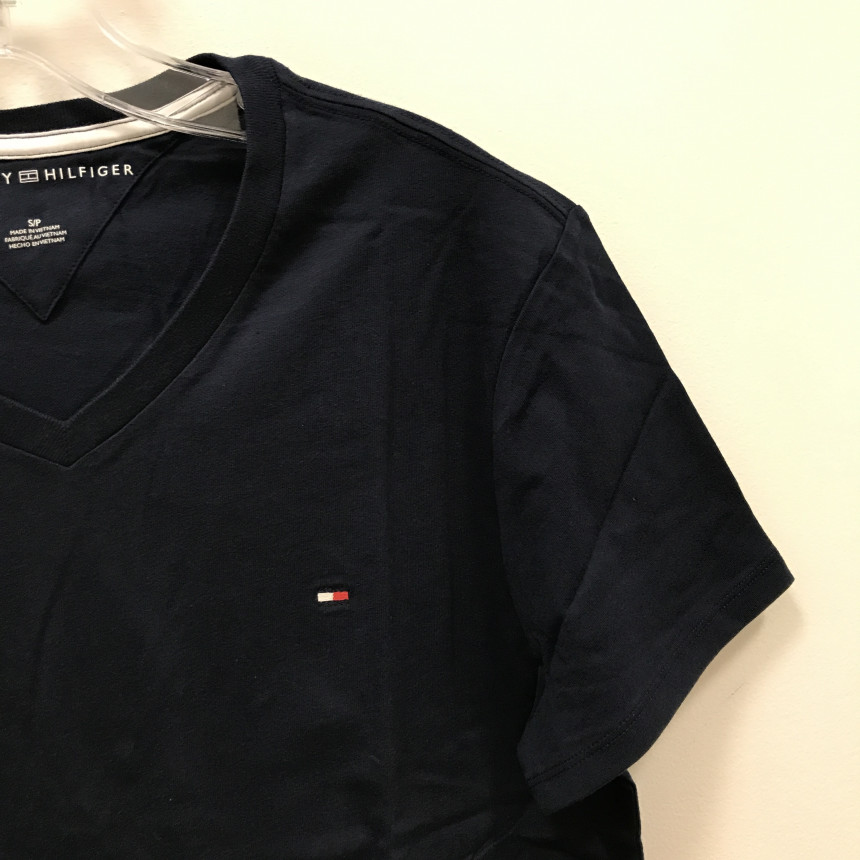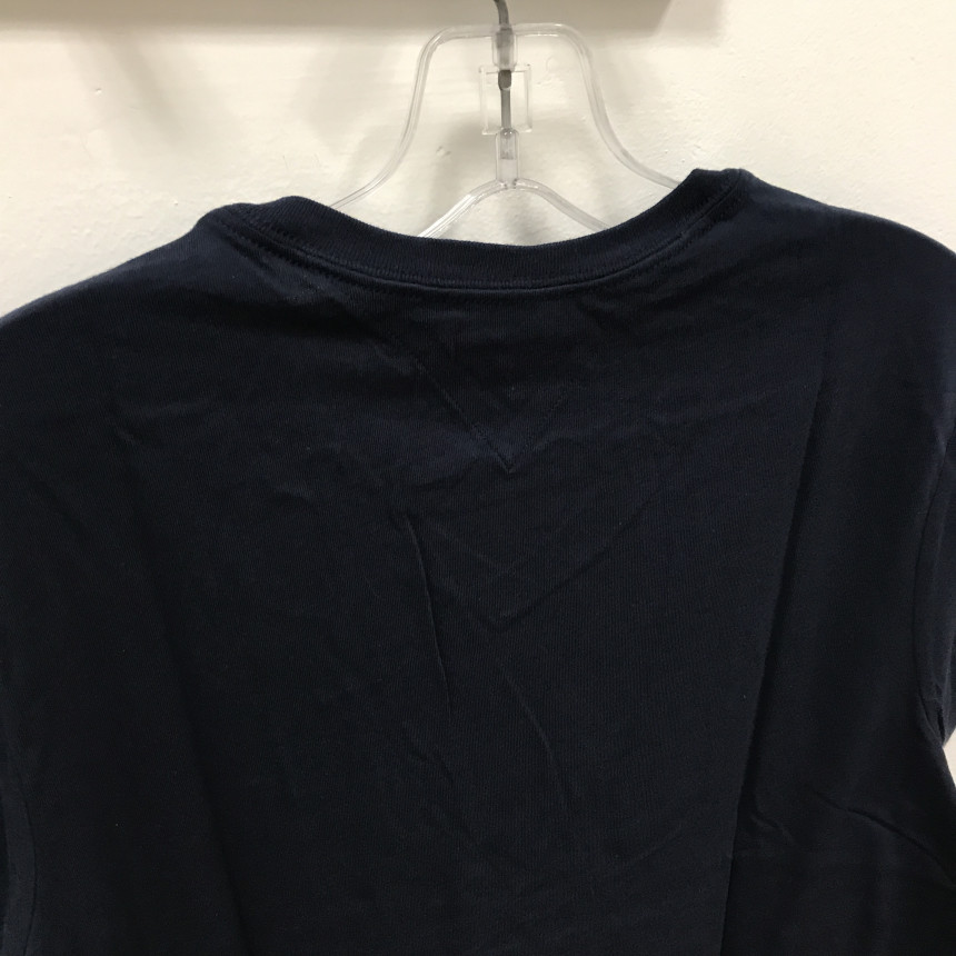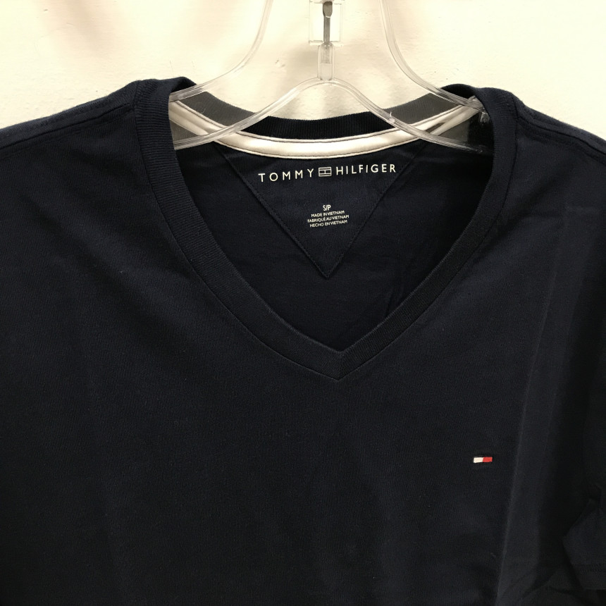 タミ・ヒルフィガーネイビーブイネク男女共用ティーシャツの上段、前、ディテールです。