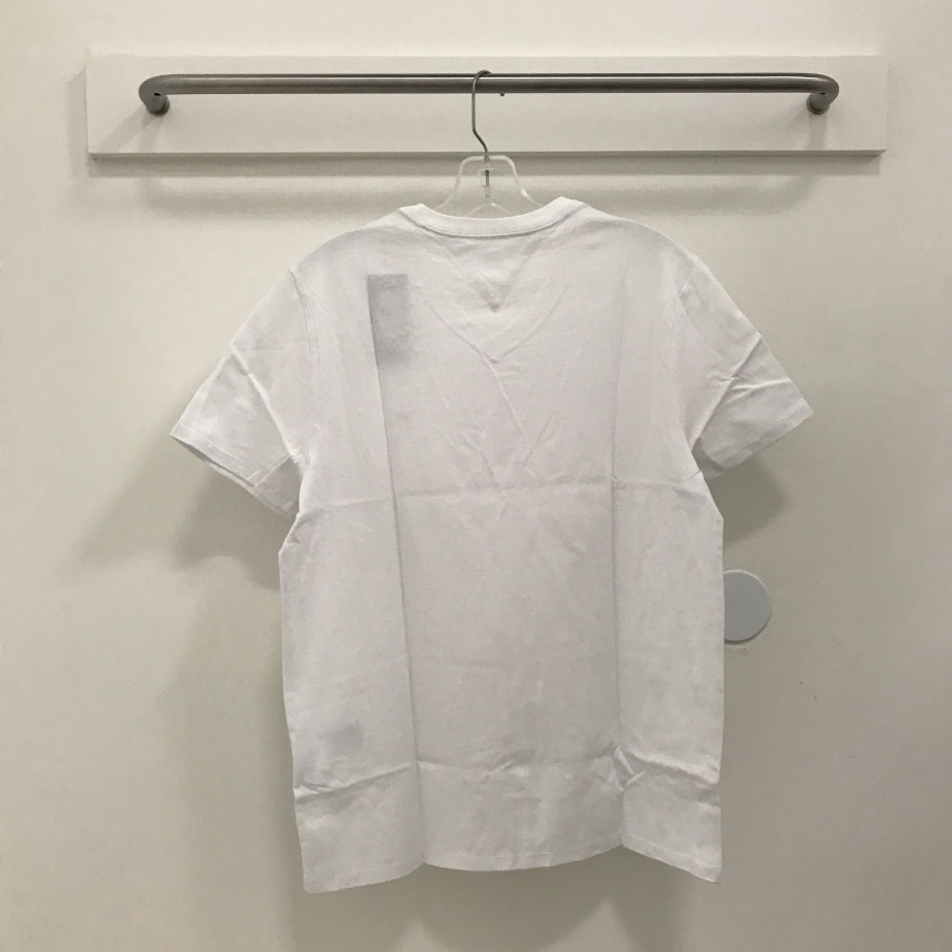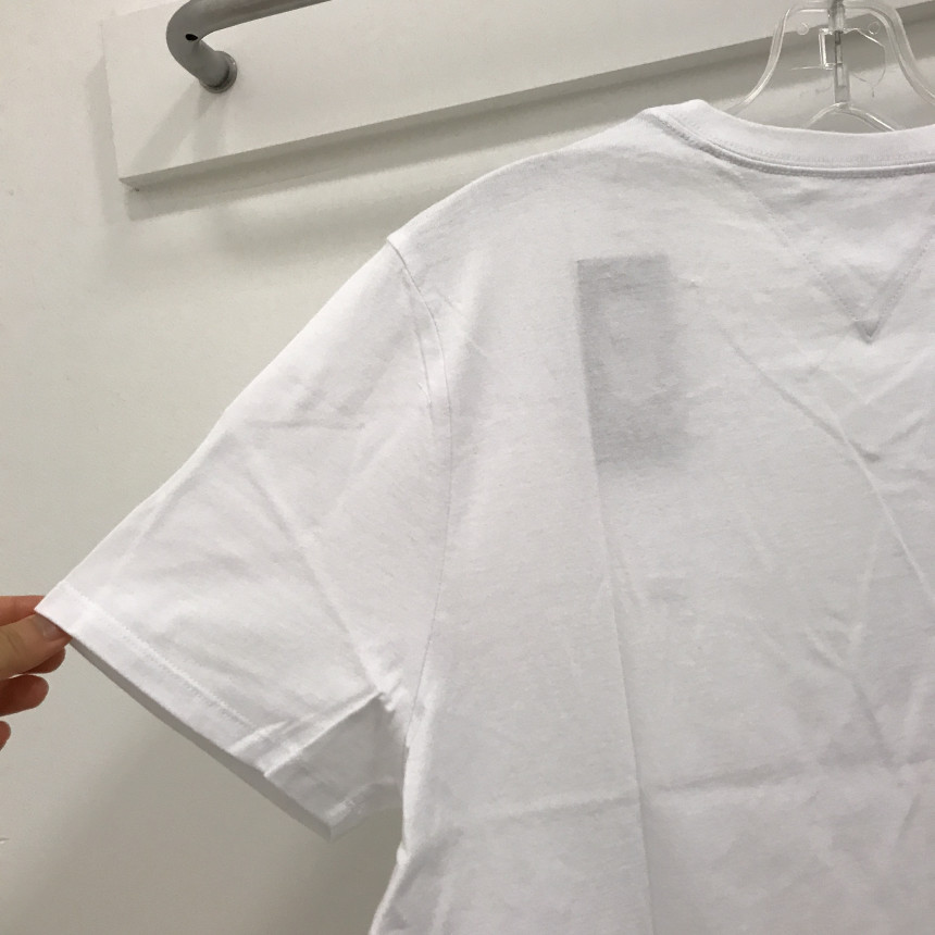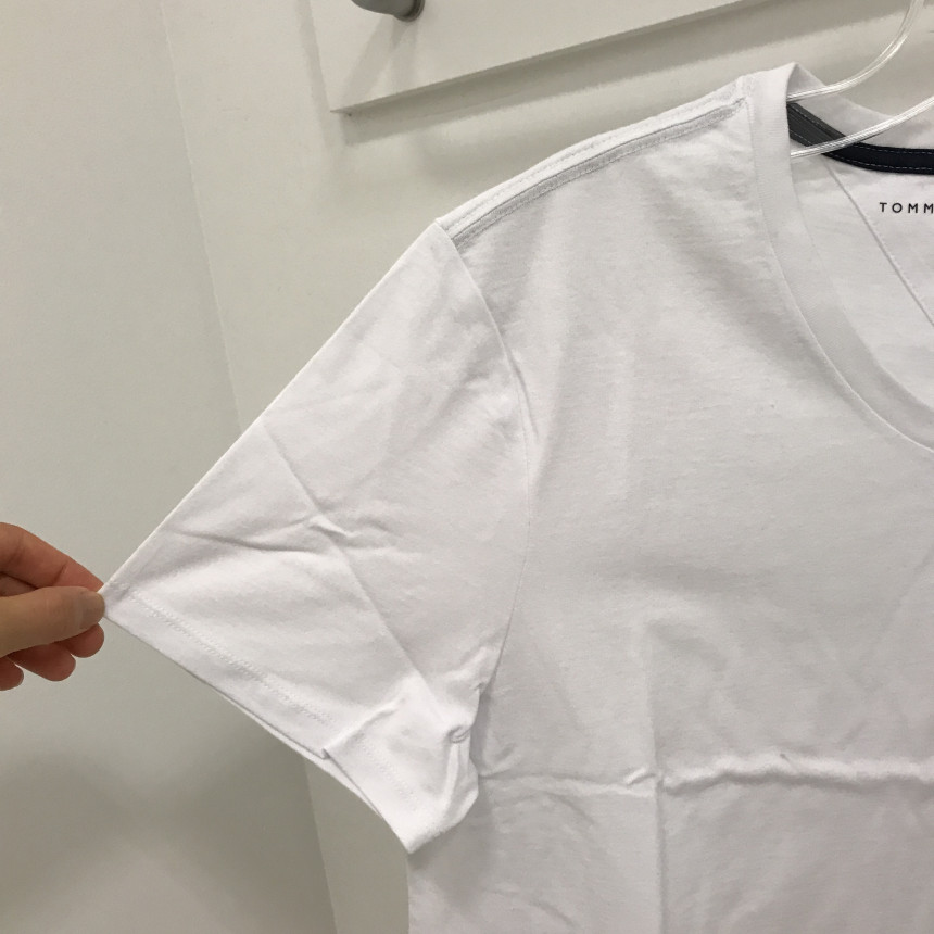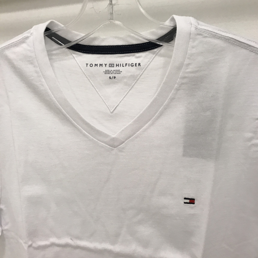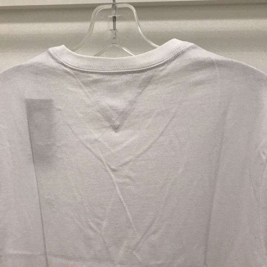 タミ・ヒルフィガーロゴホワイト男女共用ブイネクティーシャツの上段前、ディテールです。
