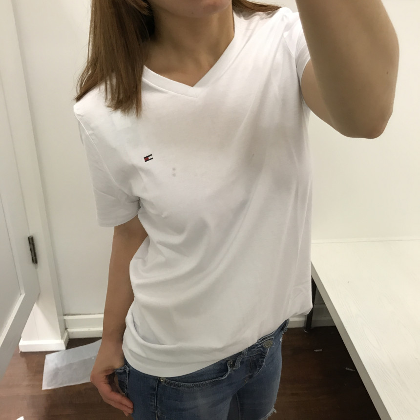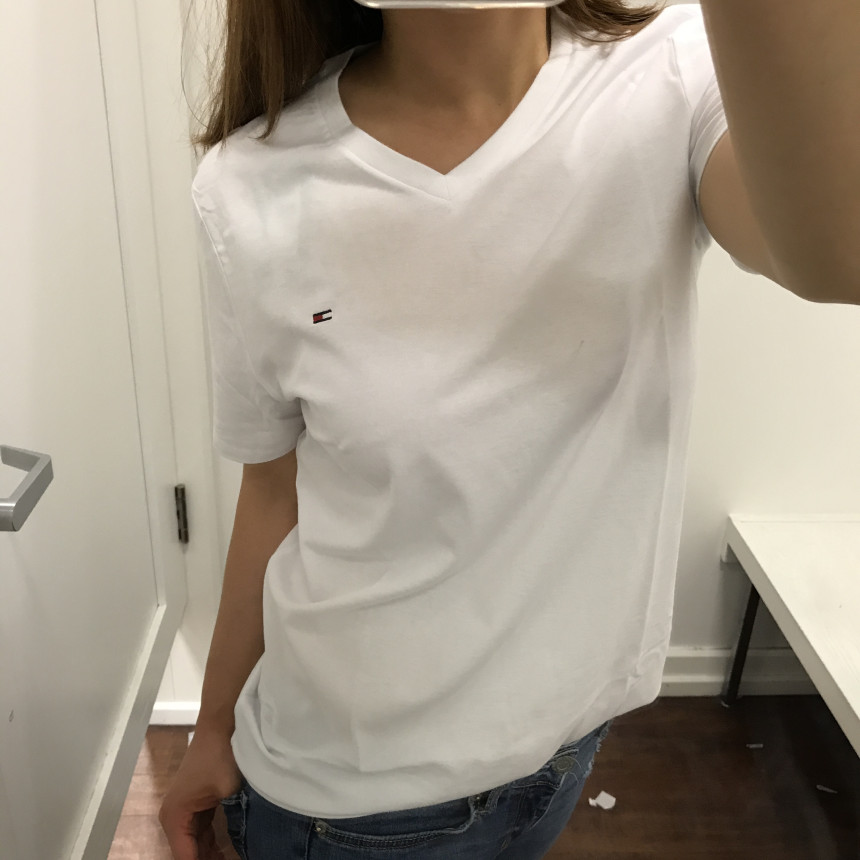 タミ・ヒルフィガーロゴホワイト男女共用ブイネクティーシャツのサイズS着用ショットです。