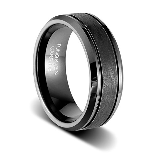 TUSEN JEWELRY 8mm Handle Brushed Two Grooved Black Polished Beveled Edges Tungsten Wedding Band Ring