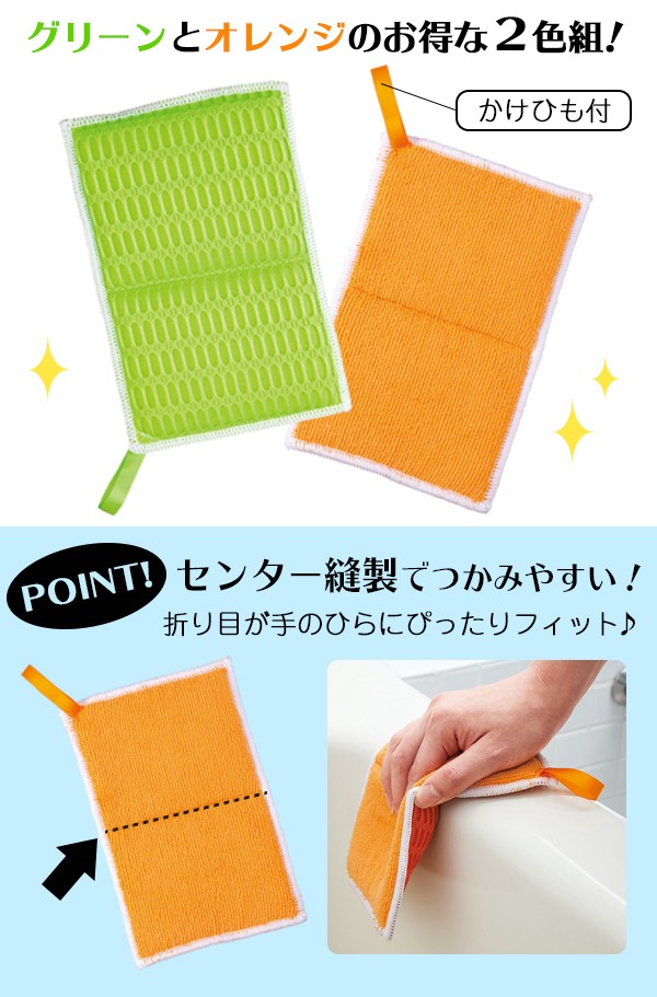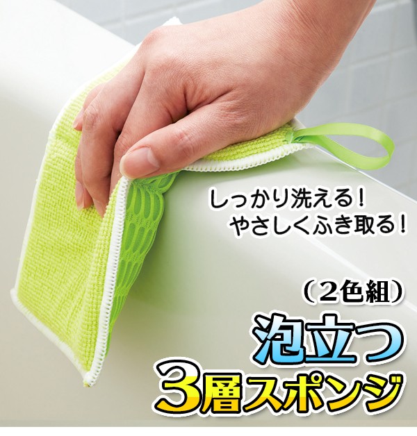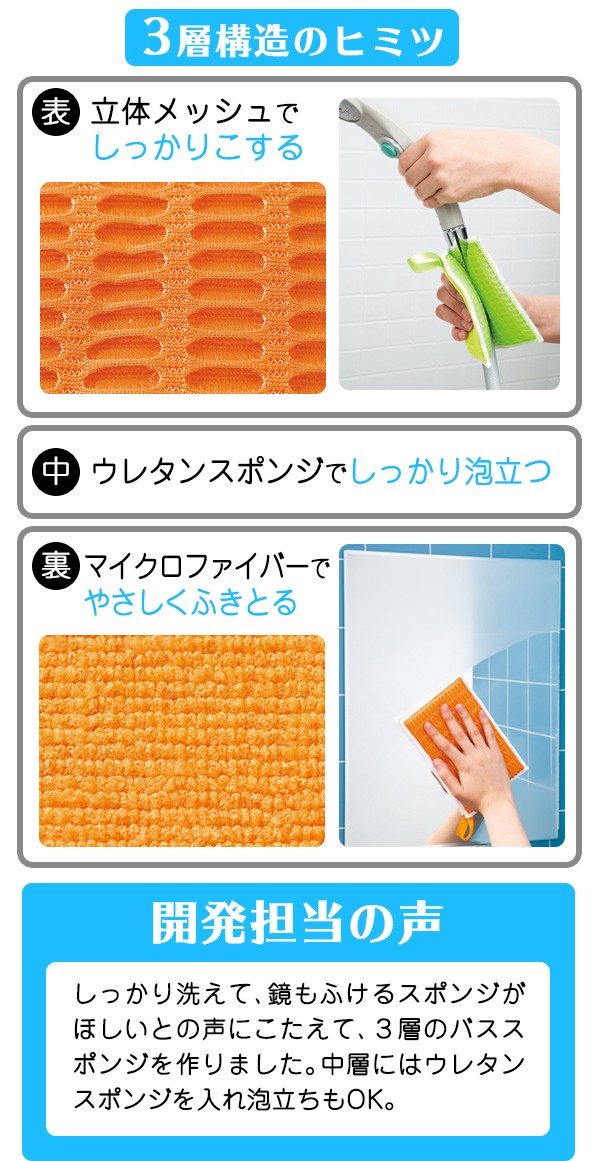 | しっかり洗えて、鏡もふけるスポンジがほしいとの声にこたえて、3層のバススポンジを作りました。表面のメッシュでしっかりこすり、裏面のマイクロファイバーでやさしく拭ける!中層にはウレタンスポンジを入れ泡立ちもOK。手のひらにフィットしやすい折り目付き!グリーンとオレンジの2色組。スポンジ/お風呂/風呂掃除/バススポンジ/3層/キレイ/マイクロファイバー/メッシュ/泡立ち |