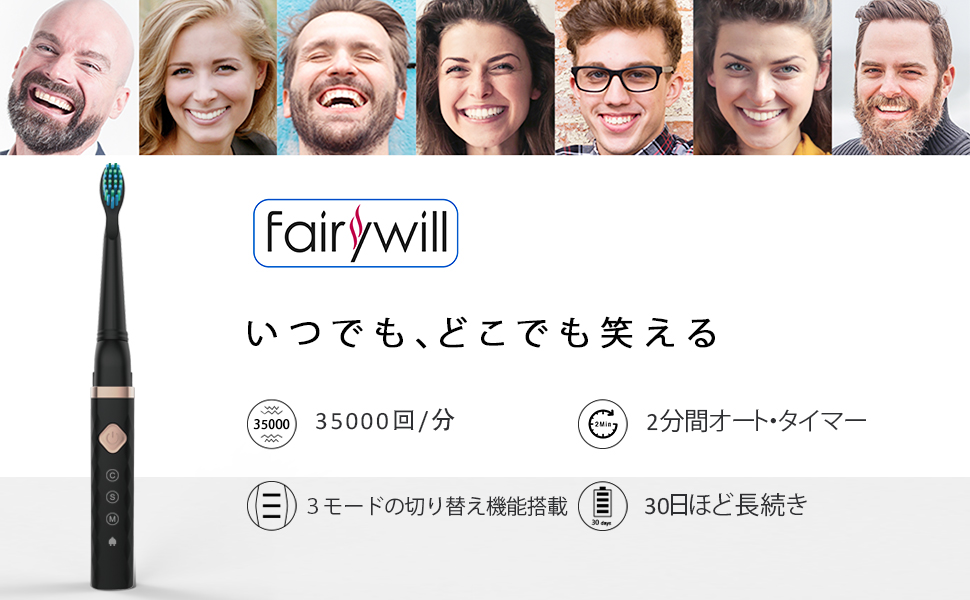Fairywillの音波式電動歯ブラシは約35,000回/分の高速音波振動で歯の間に水流を作り、手磨きで丁寧に磨いてもなかなか落ずに歯についていたヤニ・黄ばみなどの汚れも素早くキレイになります。