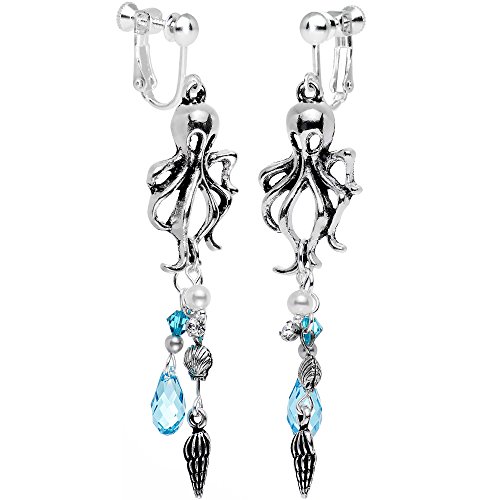 Whether you have a love for the octopus or an interest in all things of the sea, this pair of handcrafted clip on drop earrings created with Swarovski crystals is the perfect set to display your fancy for the ocean. The silver plated screwback clip on backings support the 3" length dangling design, which features an octopus charm with a cascade of blue, clear, grey, and white crystal details along with shell charms for a nautical style. Specifications: 3" (76mm) Length, Silver Plated Hinged Screw Back Clip On Backings, Non-Pierced, Hand Assembled in the USA, Created with Swarovski CrystalsFeature