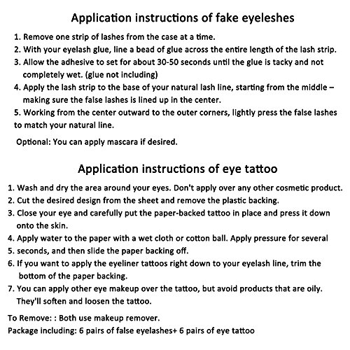 Package Contains: 6 pairs of thick fake eyelashes + 6 pairs of make up tattoo stickers (4 pairs of black stickers and 2 pairs of colorful eye stickers)