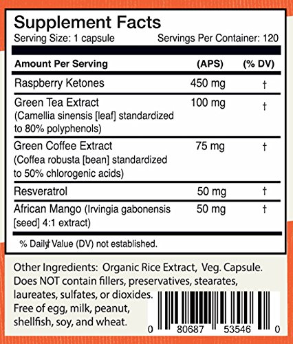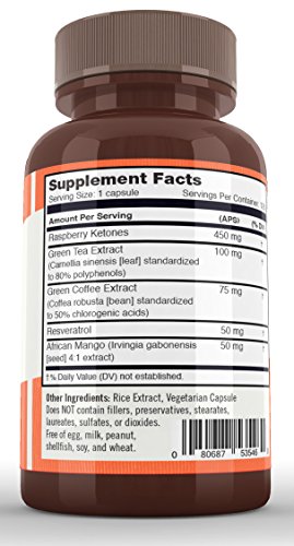 Contains 450 milligrams of Raspberry Ketones per serving Plus, Green Tea Extract (80% polyphenols) and Green Coffee Bean Extract (50% chlorogenic acids)