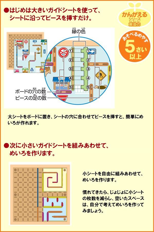 | 長さごとに色の違う8種類のピースを、ボードの穴に挿し込んでめいろを作る遊びです。めいろが完成したら、ボールを転がして遊びます。オリジナルのめいろを作って創造力・思考力を伸ばしましょう。 |