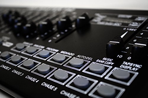 Record up to 6 chases with fade time and speeds, 16 sliders for direct control of channels, MIDI control over banks, chases and blackout, Built-in microphone for music mode