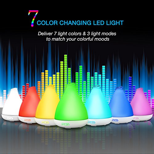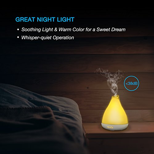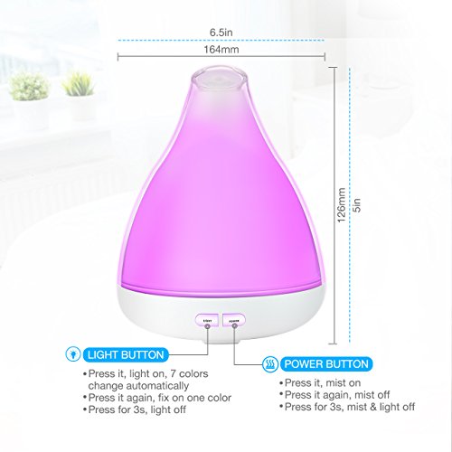 Studio : VicTsing Publisher : VicTsing Binding : Kitchen Product Description What This Diffuser Can Do for You? An Aroma Diffuser: Add 5-7 drops of aromatherapy essential oils into it, it can help remove the bad odors, like smoky smells animal odors to make your surroundings full of fresh pleasant fragrance. A Humidifier: Use it without essential oils to add more moisture to your dry skin and chapped lips, alleviating the symptom of congested sinus, nasal passages etc. A Night Light: This diffuser comes with 7 soothing light colors for you to choose from, offering you a relaxing and warm atmosphere when sleeping. Its ultra-quiet operation helps avoid disturbing your sleep, study or work. More Features Lighting Modes: 1. 7 colors cycle through 2. one fixed color 3. light off Button Instruction POWER BUTTON: First press it, mist on; Second press it, mist off; Long press it for 3s, light and mist off. LIGHT BUTTON: First press it to turn on the LED light, 7 colors will change automatically; Second press it to change the light color to some fixed one; Long press it for 3s, light off. Note: 1. Please add water-soluble essential oil into it for more fragrance and long lifespan. 2. Do not add water over MAX line. 3. Do not add essential oils through the mist outlet. 4. US Standard Plug is included in the package,which is only suitable for the US, Canada and Mexico. Specifications: Product Dimensions: 126*164mm(W*H) / in Adapter Voltage: AC100-120V 50/60Hz (US/CA) Operation Voltage: DC24V 500mA Power: 10W Package Included: 1* 120ml Aroma Diffuser 1* AC Adapter 1* User Manual 0
