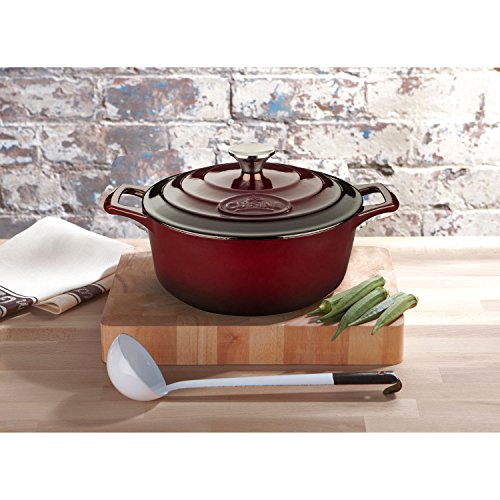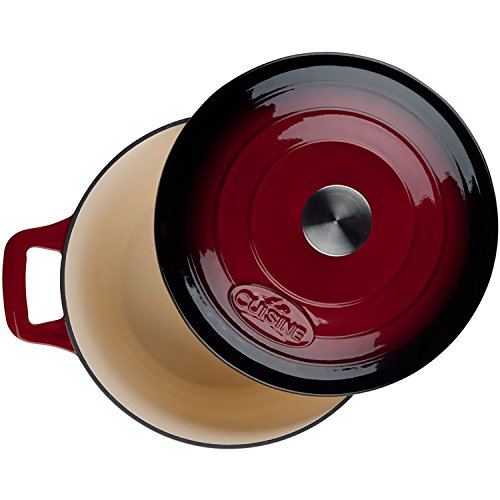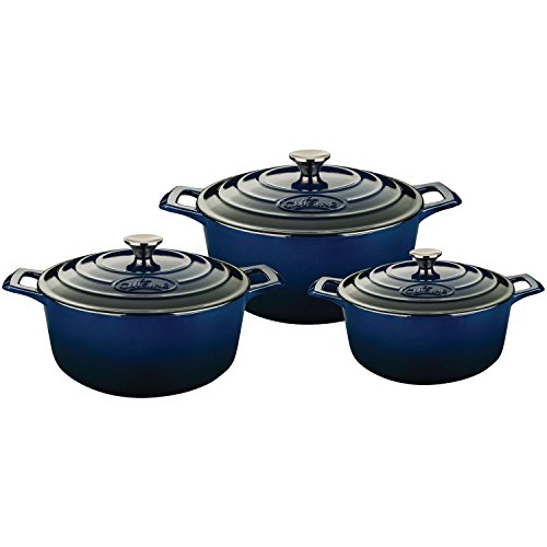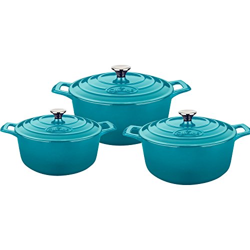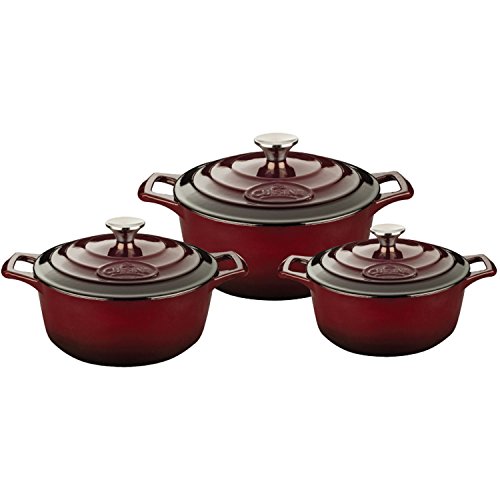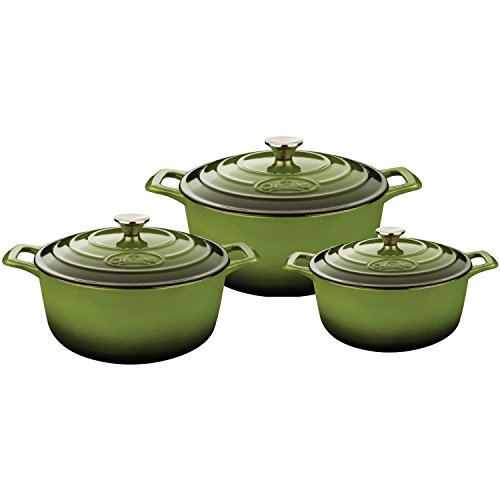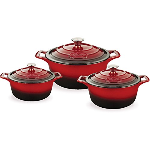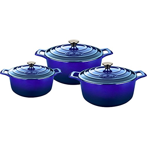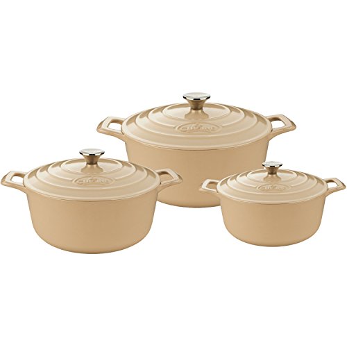 La Cuisine's 6 Pc. Round Cast Iron Casserole Set includes the 2.2-quart, 3.7-quart and 5-quart casseroles with lids. La Cuisine's cast iron cookware is crafted using sand molds, which are used only once, forging a lighter product with a very fine enamel finish that is truly unique. Wonderfully versatile, La Cuisine's round casseroles are suited to the oven and all cooktops, including induction. Food heats through evenly and remains hot until served. The non-toxic cream enamel interior surface gives excellent food release that improves through continued use, and is simple to clean – just wash in warm water. Whatever your skill level, La Cuisine is perfect for no-fuss, healthy cooking and looks great as it goes straight from cooking on the stovetop or in the oven to serving at the table or buffet (our trivets, sold separately, are recommended for table/buffet use).Feature