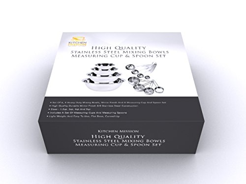 Kitchen Mission - With this set of 6 you will have a bowl for any recipe. These bowls are great making cakes, muffins, mixing sauces, marinating meats and tossing chicken wings. They have a flat base for excellent balance. A must have for any kitchen. Lightweight but built to last The attractive mirror finish adds sleek and shine to any kitchen. The sleek compact design of the bowls allows them to nest inside each other for easy storage Convenient Sizes 1.5 QT (7.75 X 2.5) 3 QT (7.75 X 2.5) 4 QT (10.625 X 3.5) 5 QT (11.5 X 3.5) Plus Measuring Cup and Spoon Sets, Light weight and easy to use, flat base, curved lip. High Quality Durable mirror finish 8/8 stainless steel construction