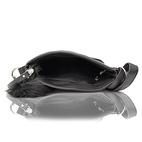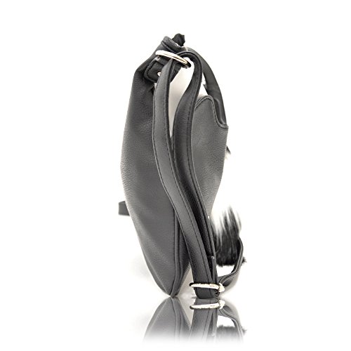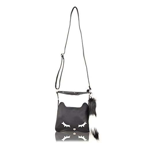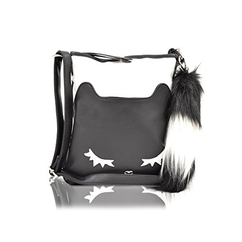 Product Description Look like the Cat's Meow with this super cute black and white faux leather cat face crossbody purse. Created from soft faux leather. Measures 9.5 inches tall x 8.5 inches wide easily fitting a small tablet, phone, wallet, sunglasses, keys, etc. Front slip pocket is the kitty face with long eyelashes and a silver tone heart as the nose. Slip pocket measures 8.5 inches wide x 5 inches tall with a magnetic snap closure. Fully lined interior with nice black fabric contains 1 large zippered pocket and 2 small slip pockets. Long faux leather adjustable strap, up to a 25 inch strap drop comfortably wear across the body or over the shoulder. Accented with a black and white faux fur cat tail dangle (10 inches). Top zip closure keeps your valuable securely in your handbag. Available only for a limited time. Makes a fantastic gift for the fun girl in your life! 0