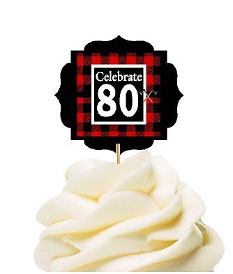 80th Birthday / Anniversary LumberJack Buffalo Plaid Novelty Cupcake Decoration Toppers / Picks -12ct