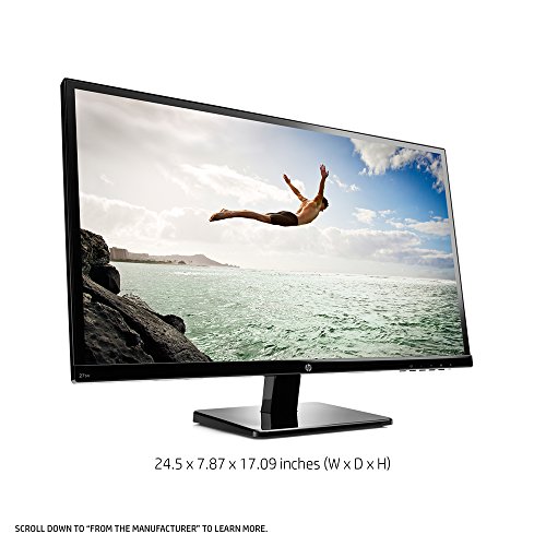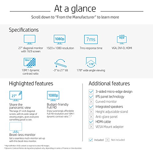 -. Feature : Monitor: 27-inch diagonal FHD (1920x1080) micro-edge IPS; A virtually edge-to-edge panel means maximized screen area and expansive entertainment. / Resolution and aspect ratio: FHD and 16:9; 2 million pixels for crystal-clear visuals and vibrant image quality. / Response time: 7ms; Get a smooth picture that looks crisp and fluid without motion blur. / Ports: VGA, DVI-D, and HDMI help you stay connected. / Audio: Integrated speakers; Get great audio built right in from the integrated speakers. / Environmental features: Mercury-free LED backlighting, Arsenic-free monitor glass, and the low halogen design promote energy efficiency.