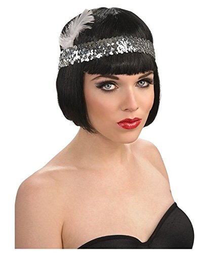 -. Brand : Rubie's -. Department : womens -. Feature : Flapper Costume Headpiece / Silver or Gold (main picture in silver) / One Size / Includes VERY SMALL Feather (unattached that you tuck into headband where you want) -. ProductGroup : Apparel -. ProductTypeName : ADULT_COSTUME -. Title : Sequined Flapper Costume Headpiece with SMALL feather