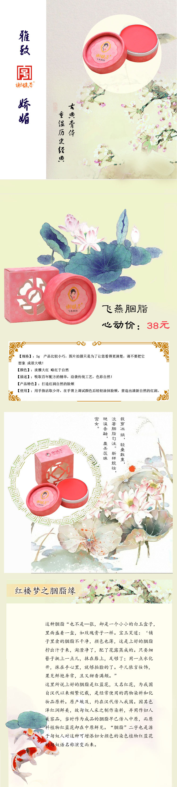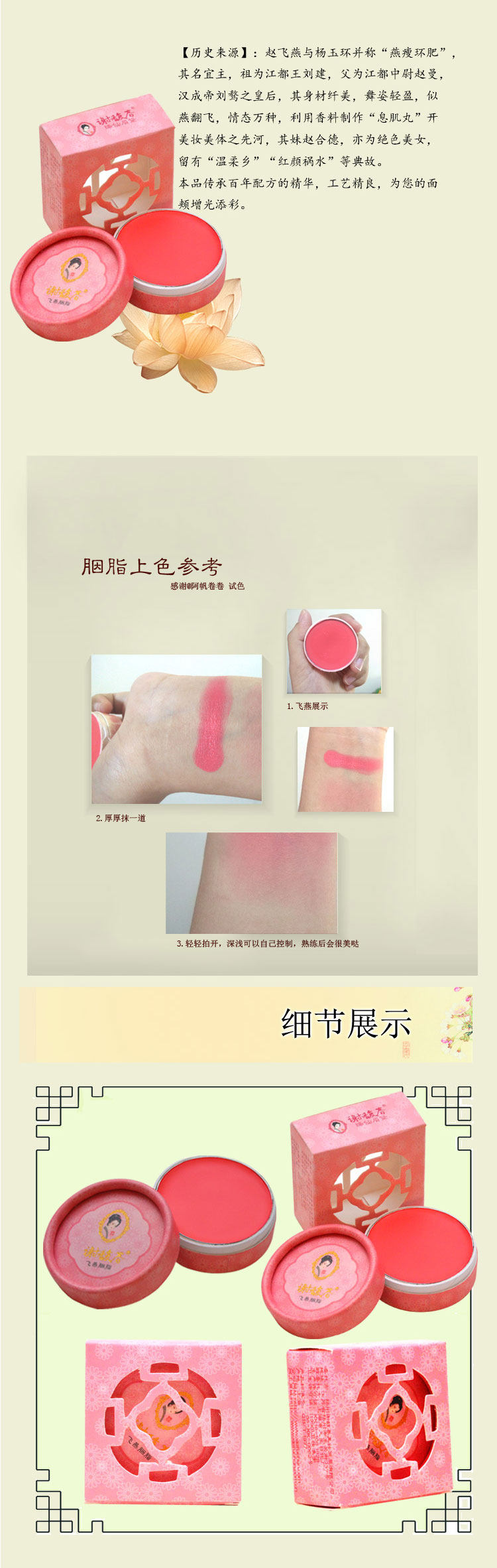 本品传承百年配方的精华,工艺精良,为您的面颊增光添彩。吸取百年配方的精华,沿袭传统工艺,色彩自然!