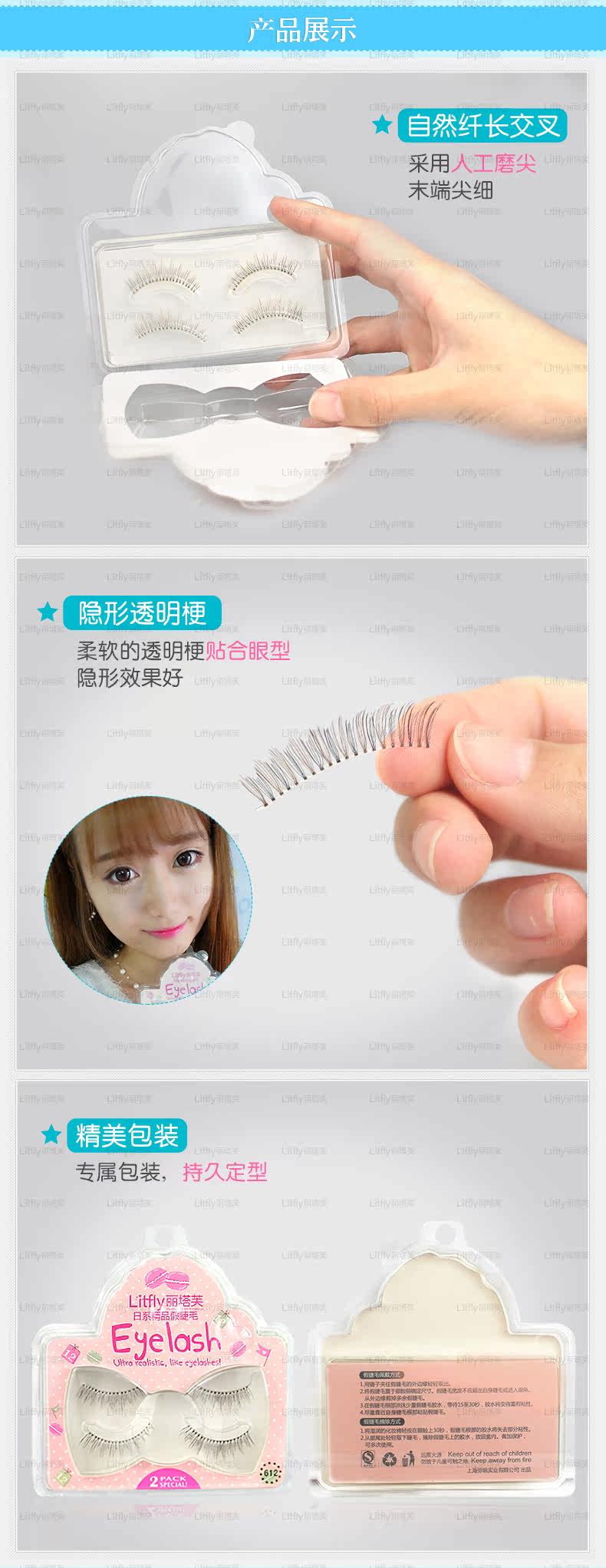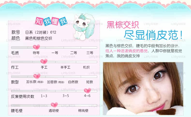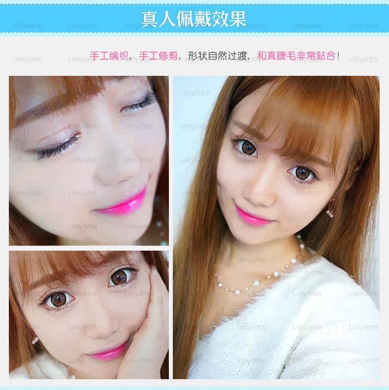 本系列假睫毛选用化纤丝制作,运用手工编织工艺及手工修剪形状,塑造磨尖毛,佩戴起来自然轻盈,可反复佩戴4-6次!