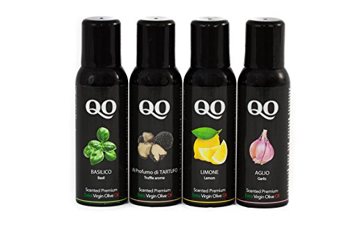 - Title : QO Infused Gourmet Olive Oil Spray Gift Set - 4.2 fl-Oz (125 ml) each (Pack of 4) - 4 Flavors: Truffle/Garlic/Lemon/Basil - Made in Italy
