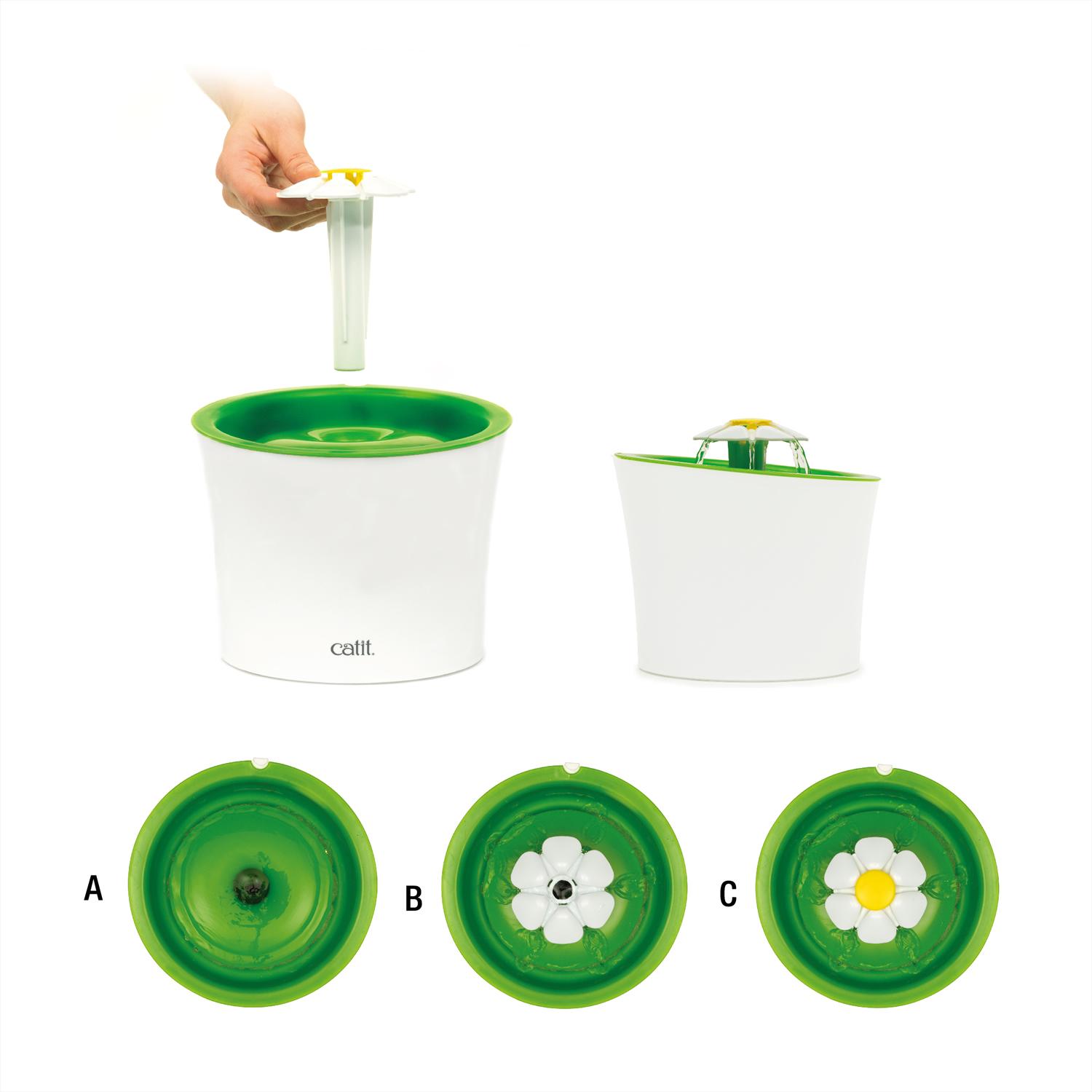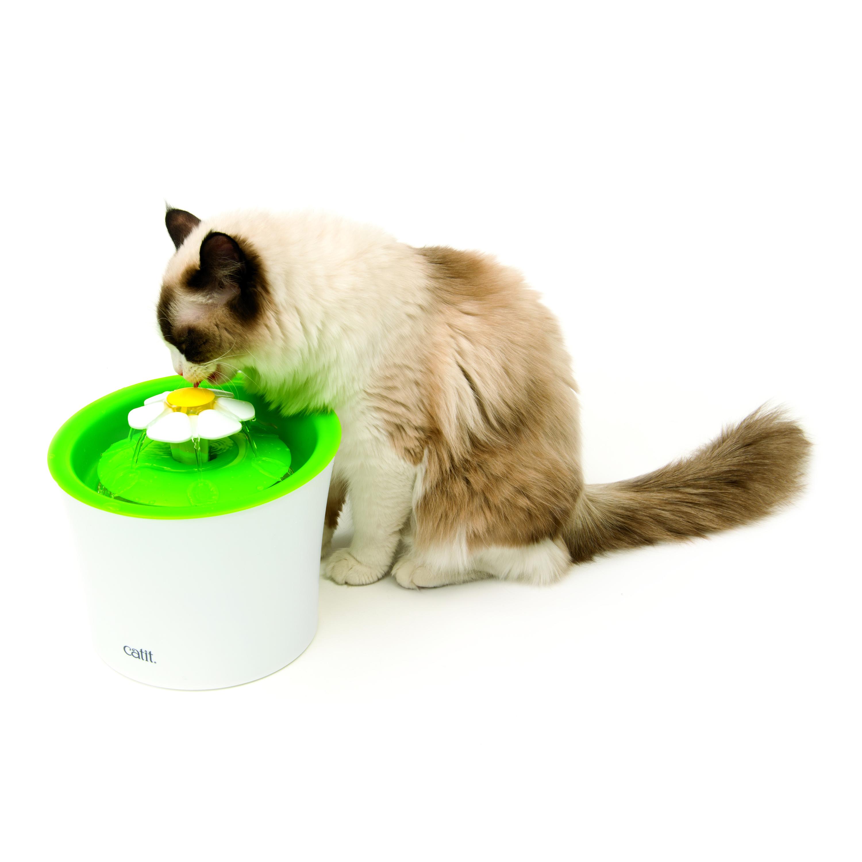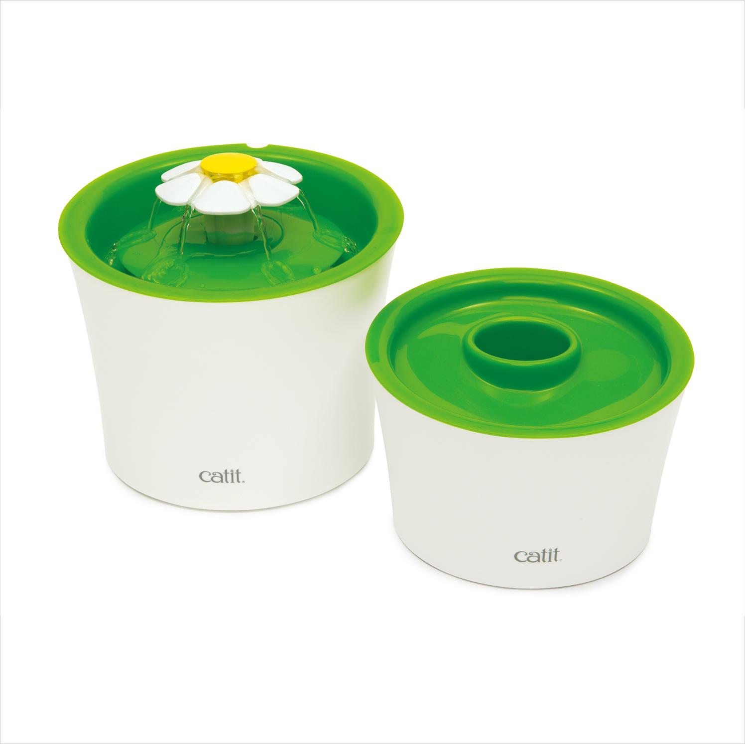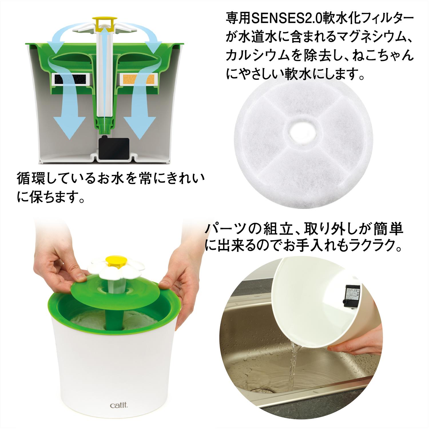 猫好きによるネコ好きのために新しい発想の楽しい、かわいい便利グッズ「catit (キャットイット)」 フィルター式の猫用給水器フラワーファウンテン 3通りの水の流れでネコちゃんも満足! ファンネル上部のフラワーパーツを付けることによって「緩やかな水の流れ」、「湧き出る水の流れ」、「穏やかな川のような流れ」を作れ、ねこちゃんの「飲みたい」を刺激する水が流れるように設計されています。 水分を充分にとることは、ねこちゃんの健康には不可欠です。 床にコンパクトに置ける、3Lの大容量設計。 飲みやすい高さと水飲み部分がひげに当たらないストレスフリーなペット工学に基づいたデザインでどんなネコちゃんにも快適。 Catitフラワーファウンテンは2重で水をろ過する軟水化フィルター(SENSES2.0軟水化フィルター)が含まれています。フィルターは水道水を常に軟水化し、被毛、食べ残し、ほこりを取り除きながら循環しています。 Catitフラワーファウンテンは簡単に取り外せてパーツを洗えます。それぞれのパーツの汚れを定期的に流水で洗い流してください。 Catitマルチフィーダー(別売)と合わせて使うことで、完璧なお食事タイムを楽しめます。 製品本体サイズ:約幅21×奥行21×高さ17cm 電源コード:約2.1m(接続部含む) 定格水量:2.3L 消費電力:4.4W/3.7W(50Hz/60Hz)