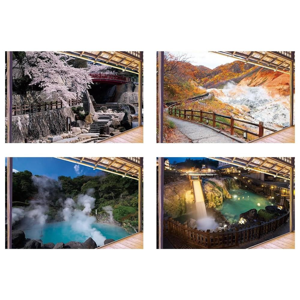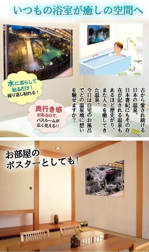 | 水をつけて貼るだけなので、何度でも貼りなおすことが出来ます。日本の名湯の風景のおかげで、いつもの自宅のお風呂も広く感じていい気分♪両面テープが付属しておりますので、お部屋の壁面に貼ることも可能です。4枚セットですので、季節や気分によって貼り替えてお楽しみ下さい。 |