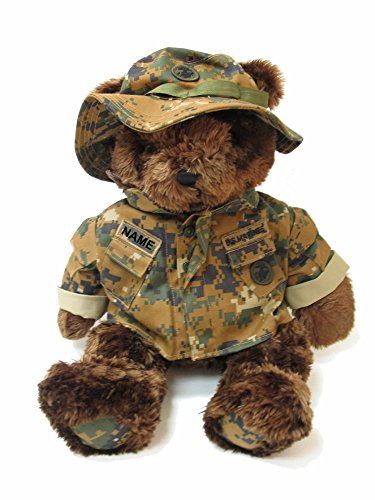 -. Binding : Toy -. Brand : Accented Apparel N More -. Feature : 18" high / Black is recommended / LAST or FIRST name only / All letters must be UPPERCASE -. Label : Ira Green -. LegalDisclaimer : Intended for display only. -. Manufacturer : Ira Green -. Model : MCPlshWood -. MPN : MCPlshWood -. PackageQuantity : 1 -. PartNumber : MCPlshWood -. ProductGroup : Toy -. ProductTypeName : TOYS_AND_GAMES -. Publisher : Ira Green -. Size : 18 inches -. Studio : Ira Green -. Title : Stuffed 18" plush teddy bear in personalized custom embroidered or plain U.S. Marine Corps Woodland MarPat Utility Military Uniform-DigiCams