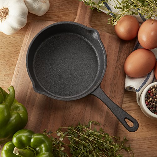 Cooking gets personal with this mini round frying pan. Perfect for Small living spaces and for preparing single-serving meals, this cast iron pan is pre-seasoned to protect the surface, and offers superior and even heating. Simply apply a light coating of cooking oil before each use. Pour spouts on either side of the pan make it easy to drain liquids from food before indulging. When you're finished cooking, it makes a great serving piece as well, whether you're having a pancake for breakfast or stir-frying veggies to complement your dinner. Plus, it can be used on multiple cooking surfaces, including stoves, induction cooktops, grills, campfires, and in ovens up to 500 degrees F. Measurements with handle: 9-1/4 x 5-3/4 x 1-1/2 inches. Hand-wash with warm water and a mild detergent; rinse and dry immediately.Feature