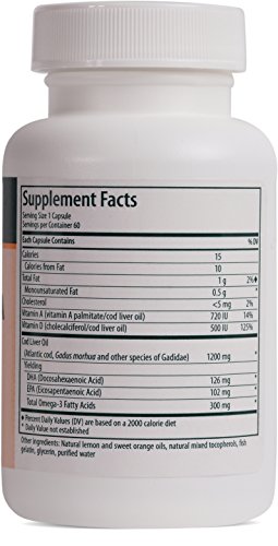 Active Ingredients: Calories 15 Calories from Fat 10 Total Far 1 g Monosaturated Fat 0.5 g Cholesterol 5 mg Vitamin A (vitamin A palmitate) 2500 IU Vitamin D (cholecalciferol) 800 IU Cod Liver Oil 1200 mg Yielding DHA (Docosahexaenoic Acid) 180 mg EPA (Eicosapentaenoic Acid) 165 mg Total Omega-3 Fatty Acids 380 mg Inactive Ingredients: Fish (swai) gelatin, glycerin, natural mixed tocopherols.