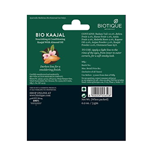 -. Binding : Misc. -. Brand : Biotique -. Feature : Apply a light line to the rims of the eyes, from inner to outer corners, for a soft smoky look. Darken lin for a smoldering finish. / Badam (Prunus amygdalus), Bahera (Terminalia belerica), Harer (Terminalia chebula), Amla (Emblica officinalis), Mulethi (Glycyrrhiza glabra), Kapoor (camphor cinnamom), Anjan (Netranjan), Kaajal (Kaajal), Ointment Base Q.S. / Biotique is based on 5000-year-old Ayurvedic recipes known to integrate and celebrate body, mind and spirit. This is th eheritage and harmony of all Biotique products, blending proven Ayurvedic therapies with the science of 21st century bio-technology. / Organically Pure & preservative free, dermatologist tested for safety, no animal testing / An extraordinary combination of ancient/modern therapies and sciences that balance the wonders of nature to support healthy well-being and spiritual bliss in your life. -. Label : Biotique -. Manufacturer : Biotique -. MPN : RETMLSTK0007 -. PartNumber : RETMLSTK0007 -. ProductGroup : Beauty -. ProductTypeName : BEAUTY -. Publisher : Biotique -. Studio : Biotique -. Title : Biotique Kaajal For Magical Eyes 3G/0.11Fl.Oz.