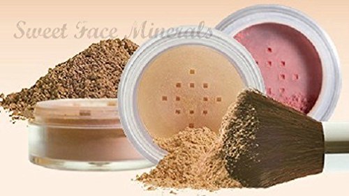 Mineral Foundation: Sweet Face Minerals foundations are all natural and very lightweight. Our products never appear heavy or look caked and are wonderful for every skin type. Will not cause irritated itching skin or acne. Perfection Finishing Powder: This silky feather-soft powder provides weightless, breathable layering to your skin. Brush it on after your makeup has been applied. It's light and delicate and gives the appearance of perfection! Mineral Concealer: Our concealers will offer more coverage than your regular foundation blend. Concealers are ideal for hiding dark under eye circles, and concealing blemishes, camouflaging imperfections and will help to neutralize the look of splotchy skin. Large Full Coverage Kabuki: The silky head of this brush will cover large areas for quick results. Includes an instruction card for applying your makeup like a pro. The Foundation and Finishing Powder come in 30 gram sifter jars filled to 15 gram capacity. The Concealer comes in a 20 gram sifter jar filled to capacity with 9 grams of powder.Feature