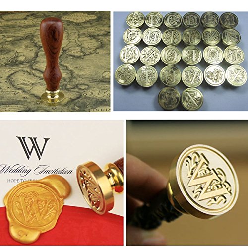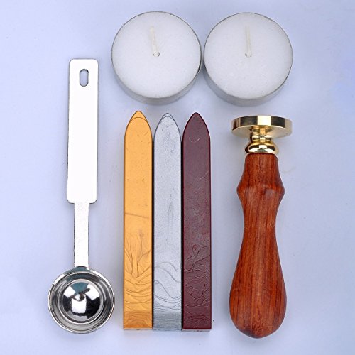 Vintage Letter Badge Wax Seal Stamp Sticks Melting Spoons Candles Set, Gold-plated copper head with teardown,Wood handle;