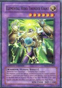 -. Brand : Yu-Gi-Oh! -. Edition : Promo -. Feature : A single individual card from the Yu-Gi-Oh! trading and collectible card game (TCG/CCG). / This is of Parallel Rare rarity. / From the Mattel Action Figure Series 1 set. / You will receive the Promo Edition version of this card. -. IsAdultProduct : 0 -. ItemPartNumber : MF01-EN001 -. Label : Konami -. Manufacturer : Konami -. Model : NA -. PackageQuantity : 1 -. ProductGroup : Toy -. ProductTypeName : COLLECTIBLE_CARD -. Publisher : Konami -. Studio : Konami -. Title : Yu-Gi-Oh! - Elemental Hero Thunder Giant (MF01-EN001) - Mattel Action Figure Series 1 - Promo Edition - Parallel Rare
