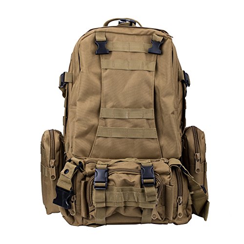 -. Feature : [SMART SIZE] Main Compartment(approx): 51 x 34 x 15cm/20.1 x13.4 x6 "(H x L x W). / [ALL-in-1 TACTICAL BACKPACK,3 MOLLE BAGS] Excellent Value Money Saving, All Useful. 50L Large Backpack with 3 Molle Packs, with a detachable bag that can be used as a waist,fanny or shoulder pack & two removable side packs, you get triple the options to configure for your mission Suitable place to put the Hydration Water Bladder, Tactical Cap, Survival Multifunctional tool knife, ect.). / [DESIGN FOR THE TOUGHEST OF TERRAINS] Tactical backpack made of Rugged Weather Resistant 600D high density Polyester fabric & heavy duty big teeth zippers. / [MULTIPLE STORAGE SPACE& METHOD] This tactical backpack is Multiple exterior and interior pockets for organized storage, MOLLE compatible for pouches and attachments,You also can add on additional pouches & other tactical gear. / [ERGONOMIC STRESS DESIGN] Air permeability,Heat dissipation.Padded and Adjustable shoulder strap, Adjustable & removable chest belt and hip belt for heaving loading, Breathable mesh backing for comfort. Great ideal for outdoor activities: camping, hiking, trekking, traveling, etc.