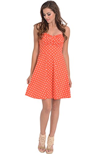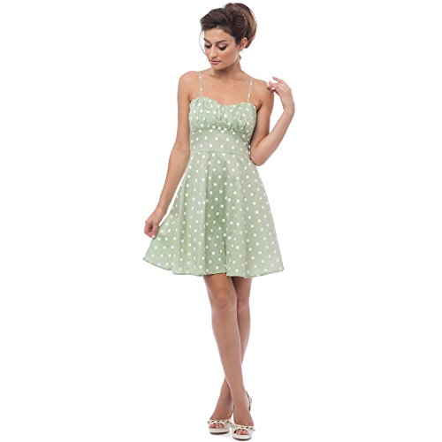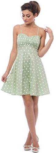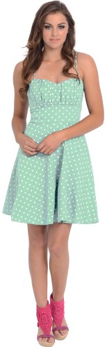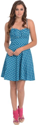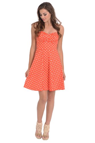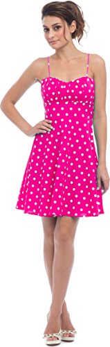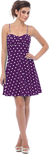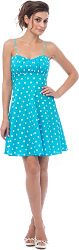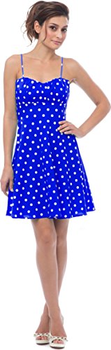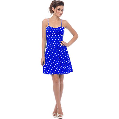 50s style cotton polkadot print knee-length dress with spaghetti straps accentuates in all the right places. Zip back.