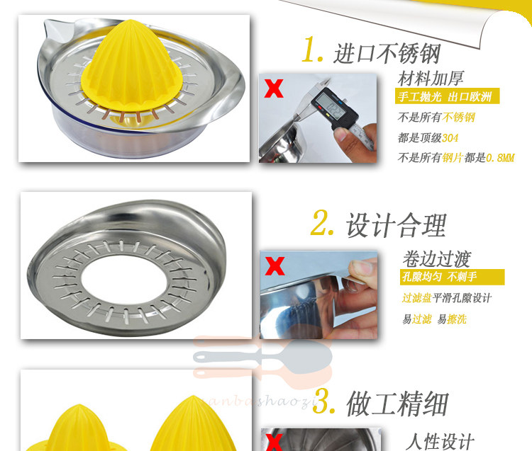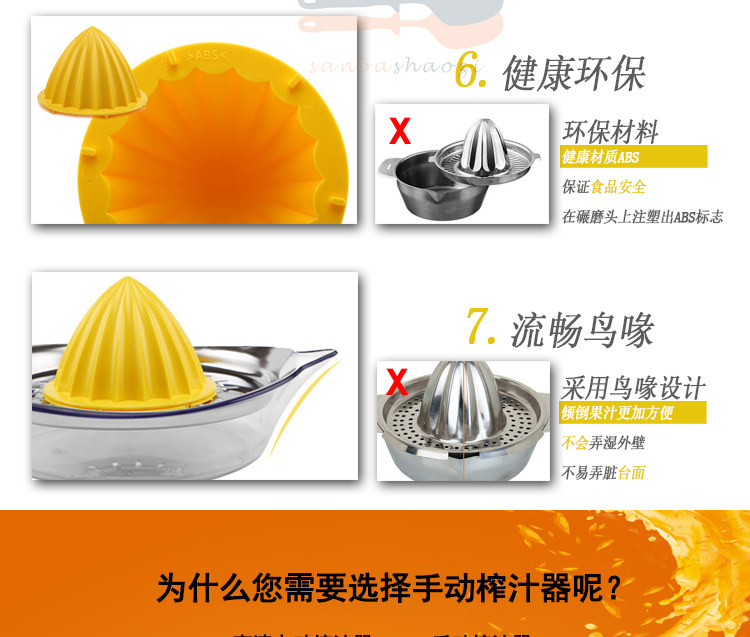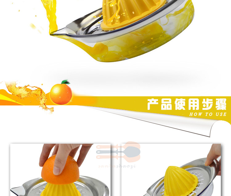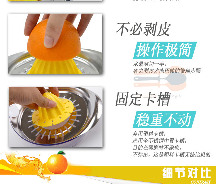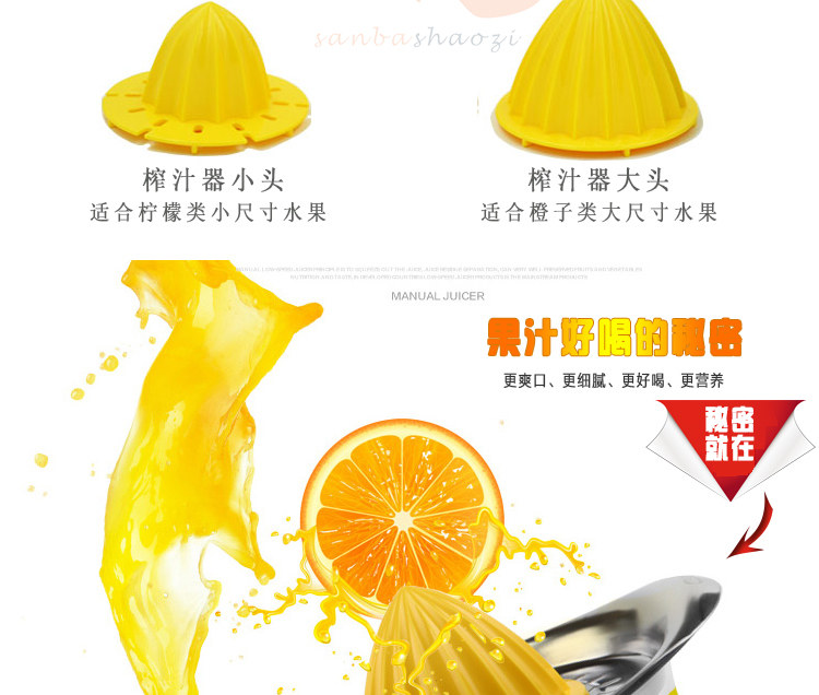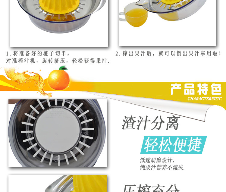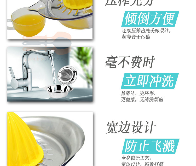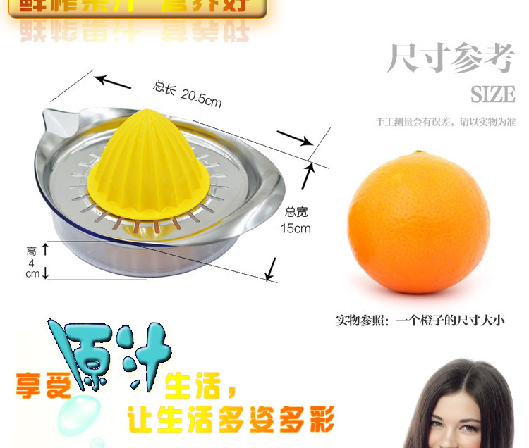 Product Name: Manual lemon juicerMaterial: AS + ABS plastic + stainless steelSpecifications: Length 20.5cm width 15cm height 4cm capacity 450mlTotal weight: 249g