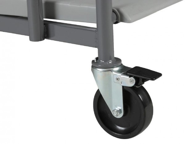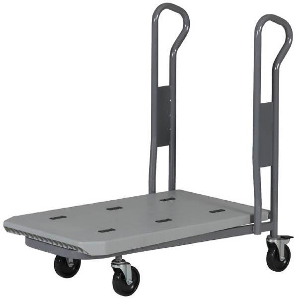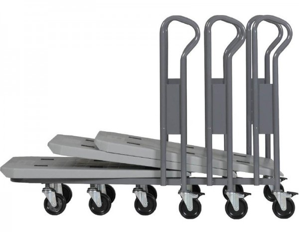 台車を後方より押し込むと台板部がはね上がり、下に重なるように入り込む構造になっています。収納効率に優れるネスティング機構付きの4輪台車です。