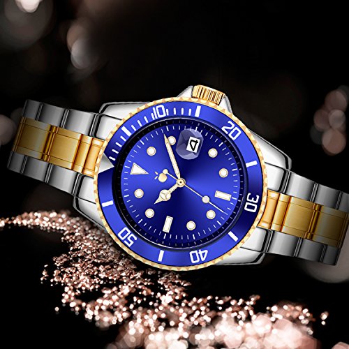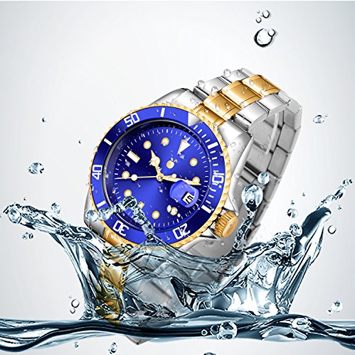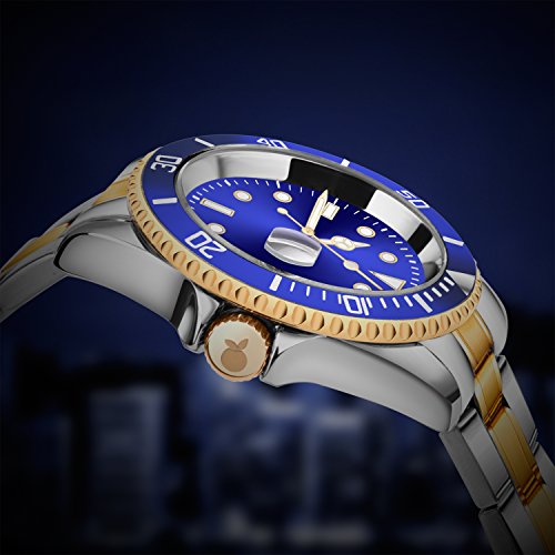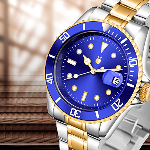 -. Binding : Watch -. Brand : ORANGE -. Department : Mens -. Feature : Stainless steel watch with 40mm polished silver tone round case & stainless steel screw down case back. / Polished stainless steel unidirectional ratcheting gold tone coin-edge bezel with gold center fill, protective and scratch resistant mineral crystal. / Japanese quartz movement with analog display, Stainless steel bracelet with gold-tone center links and foldover clasp with safety closure / Additional feature:a magnified date window at 3 o'clock.The date is more clearly displayed for you. / Professional diver watch water resistant to 30 Meters,not for swimming and diving. -. Label : ORANGE -. Manufacturer : ORANGE -. MPN : 001 -. PartNumber : 001 -. ProductGroup : Watch -. ProductTypeName : WATCH -. Publisher : ORANGE -. Studio : ORANGE -. Title : ORANGE Men's Quartz Watch Blue Dial Silver Gold Two Tone Stainless Steel Watch with Date