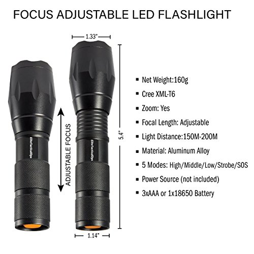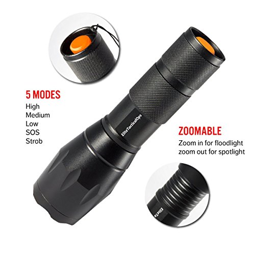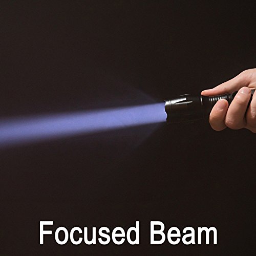 - ✔ 5 LIGHT MODES & ZOOM FUNCTION: Full Brightness, Medium Brightness, Low Brightness, Strobe Brightness, SOS. Adjustable focus for close or long range. Functions as a spotlight that throws an intense beam of light up to 600 feet ahead or compact small floodlight that brings illumination to a wide area.