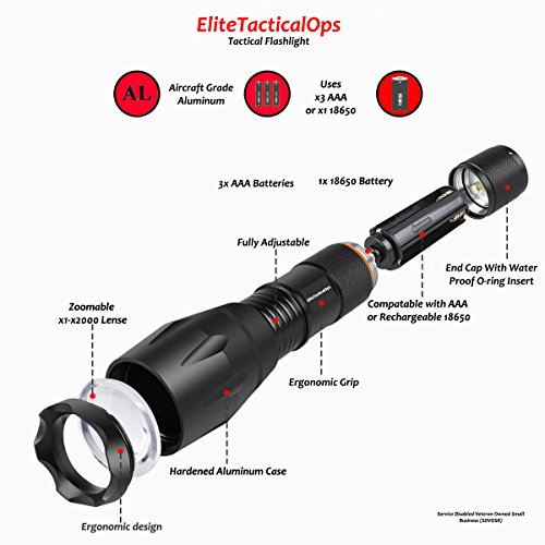 Tactical Flashlight, Waterproof, Military Grade, LED, Rechargeable, 18650, Super Bright - By Elite Tactical Ops