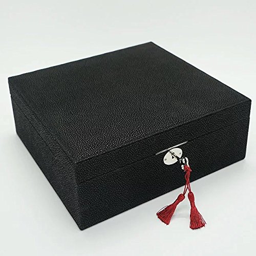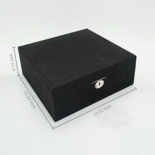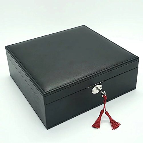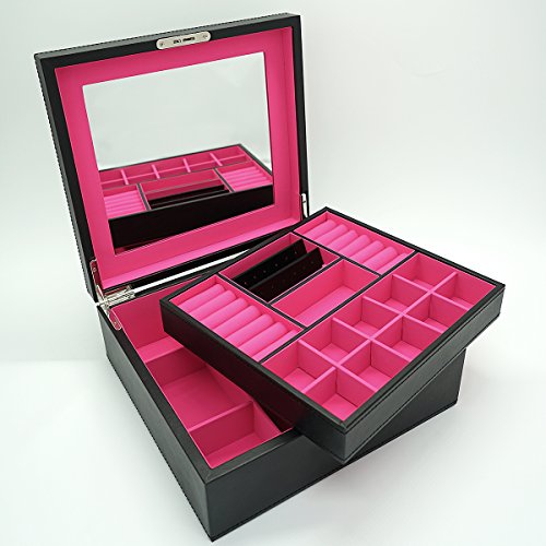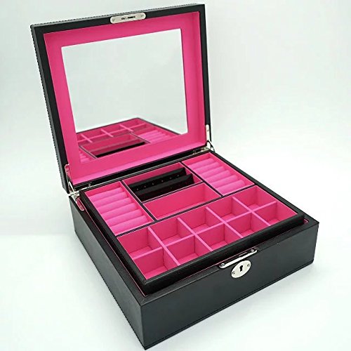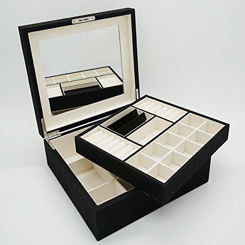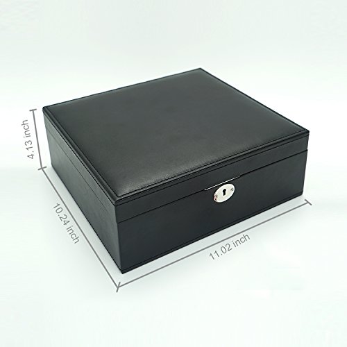 -. Feature : Exquisite Craft -- Made of black faux leather and lining,With MDF box frame, Size: 11.02"LX10.24"WX4.13"H(28X26X10.5CM) ,Weight: 4.95lb / Rational layout -- Multi-size compartments, Jewellery Box had compartments of various sizes and shapes to keep all types of jewelry separate,Organized and eatly displayed,which can effectively prevent the scratching of items,thus all jewelry can keep in order / Large storage space -- Provide sufficient storage space for necklaces, watchs,bracelets, earrings, ear studs, hairpins, cufflinks, brooches and other jewelry / Classic Design -- High quality hardwaree fitting, Lid with a big mirror / Multiple function -- This makes a great gift for mother, girlfriend,wife, daughter, colleague,friend or any other special woman in your life.