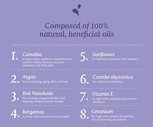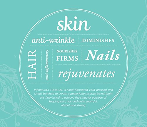 A 100% ALL- NATURAL, VEGAN & CRUELTY-FREE proprietary fusion of oils created to heal and nourish skin, nails and hair. Infinatura's CURA Oil is hand- harvested, cold-pressed, and small-batched to create a powerfully curative blend. A dry oil so it absorbs easily, quickly, without leaving a greasy or heavy film. Eight hand-selected 100% natural oils: CAMELIA OIL: Camellia Oil helps to reduce the appearance of fine lines, wrinkles and skin imperfections, such as stretch marks. It also helps to provide relief to skin conditions, such as eczema and psoriasis, as well as soothing itchy skin. CRAMBE ABYSSINICA: Crambe Abyssinica Oil is a natural emollient and lubricant to massage into the skin, hair and nails. ARGAN OIL: Argan Oil from south western Morocco moisturizes and revitalizes the skin. SUNFLOWER OIL: Sunflower Oil helps to maintain moisture and vibrancy. VITAMIN E OIL: Vitamin E Oil nourishes and protects against free radical damage. RED MANDARIN OIL: Red Mandarin Oil helps to clear congested skin and combat stretch marks. BERGAMOT OIL: Bergamot Oil helps to treat flaky, cracked irritated skin and nails. GERANIUM OIL: Geranium Oil helps to promote circulation to tone and oxygenate the skin and has anti-aging benefits. This unique fusion of oil provides the perfect beauty SOS treatment for the skin, hair and nails without feeling heavy or greasy.Feature