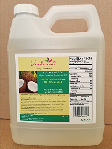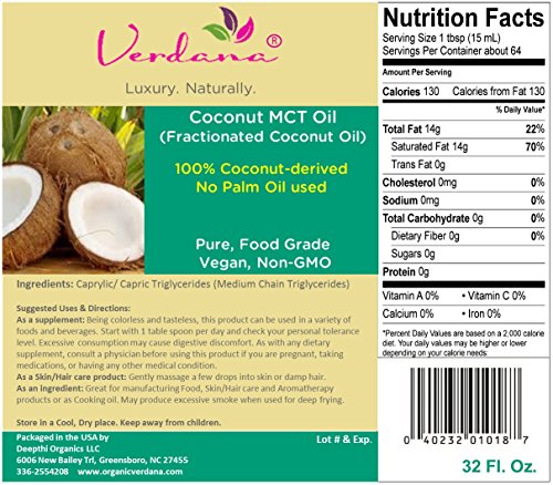 Studio : Organic Verdana Publisher : Organic Verdana Product Description INCI Name: Caprylic/ Capric Triglycerides. Organic Verdana 32 oz Fractionated Coconut oil also known as Coconut MCT oil is made from food grade coconut oil and consists of almost completely C8 and C10 (Caprylic and Capric) triglycerides. Other brands tend to have a significant amount of C12 oil (Lauric acid) which is actually a 'long' chain oil. Our product is Colorless, Odorless and with very long shelf life. (There is no such thing as 'organic' MCT oil or 'organic' Fractionated Coconut oil. Such claims by some vendors are not true. The 'fractionation' process by definition is not organic. But it is possible to make sure that the fractionation process is responsible and that it does not impart harmful synthetics into the product. This is how our Fractionated Coconut oil has been manufactured). Beneficial For The Skin: Organic Verdana feather-light Coconut MCT oil heals and softens damaged and dry skin. Since the MCT oil aka fractionated coconut oil is easily absorbed into the skin, it won't clog pores and you'll never be left with the 'greasy' feeling of other plant-based carrier oils. Being 100% saturated fatty acid, it gets quickly absorbed in the digestive system without the aid of digestive enzymes and bile acids etc., Our MCT oil is 100% pure, non GMO and batch tested for purity. Perfect Carrier Oil for Essential Oils and Massage: Completely soluble with all essential oils and is colorless, odorless and can be used for very long periods when stored in correct conditions. This MCT oil is ideal for massage, as well as mixing with other carrier oils and essential oils. (Buyers are responsible to take adequate precautions and conduct their own tests to confirm suitability of this product for the intended use including regulatory requirements). 0