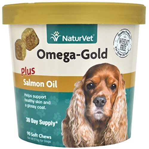 NaturVet Omega-Gold Plus Salmon Oil Supports Healthy Skin and a Glossy Coat. Omegas Plus Salmon Oil Help Maintain Normal Moisture in Dry Skin. Excellent Source of DHA and EPA. Wheat Free, Tasty Soft Chews 180ct for Dogs, 30 Day Supply Based on a 40 lb. Dog. Guaranteed Analysis per 3 soft chews: Linoleic Acid (Omega-6 Fatty Acid), Linolenic Acid (Omega-3 Fatty Acid), DHA and EPA. All NaturVet Products are Veterinarian Formulated and Manufactured in the USA in an FDA Audited, cGMP Compliant Facility with a 100% Satisfaction Guarantee.Feature