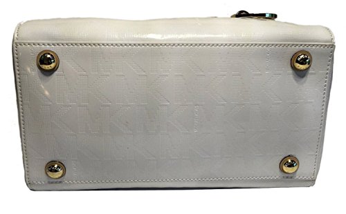 This beautiful Grayson satchel is wrapped in high gloss white PVC with MK block lettering and trimmed in tan leather with polished golden tone hardware. The interior is lined in Kors logo fabric and features a zippered pocket and four open slip pockets. It has a fully zippered top closure. The front is accented with a removable Kors circular logo hang charm, and the bottom features four metal feet to help protect it. The dual tan leather straps have a drop of 5 inches and are accented with buckles and pyramid stud detailing. The overall measurements are approximately 11.5 inches (L) x 8.5 inches (H) x 6.5 inches (W).Feature