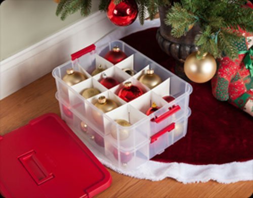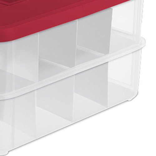 Product Description Stack carry and protect all of your holiday decorations with the Christmas Ornament Storage Boxes. These storage bins are made from quality plastic that is strong enough to support the weight of all your favorite trinkets. The bright red lid is easy to spot among other storage bins and the clear bins make it simple to find contents without digging through. Two side latches securely clasp the two bins together reinforcing the strength of the entire piece. A top handle makes it super simple to transport this caddy throughout the home or from place to place. A recessed lid on each bin allows them to stack securely. You can even purchase this organizer in multiples and stack them together to create the biggest and best in holiday storage. This storage piece comes with included dividers. These thick cardboard dividers create up to 24 compartments in varying sizes perfect for fitting everything you have in one box. Proudly made in the United States this Christmas Ornament Storage Box fro 0