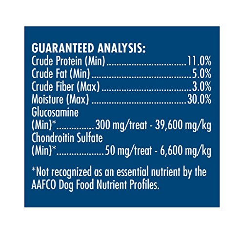 Crude Protein (Min) 11.0%; Crude Fat (Min) 5.0%; Crude Fiber (Max) 3.0%; Moisture (Max) 30.0%; Glucosamine (Min)* 300 mg/treat – 39,600 mg/kg; Chondroitin Sulfate (Min)* 50 mg/treat – 6,600 mg/kg