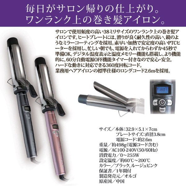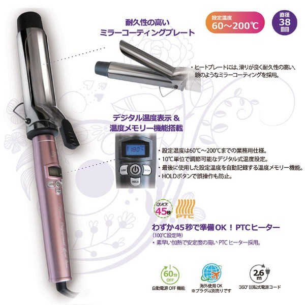 サロンで使用頻度の高い38ミリサイズのワンランク上の巻き髪アイロンです。ヒートプレートには、滑りが良く耐久性の高い、鏡のようなミラーコーティングを採用。素早い加熱で安定度の高いPTCヒーターを採用し、忙しい朝でも、電源を入れてからわずか45秒で準備OK。デジタル温度表示と温度メモリー機能も搭載し、より機能的に。60分自動電源OFF機能タイマー付きなので安心・安全。ハードな動きに対応できる360度回転コード。業務用ヘアアイロンの標準仕様のロングコード2.6mを採用。