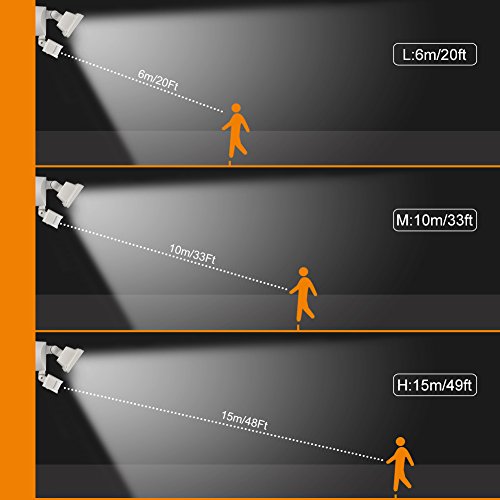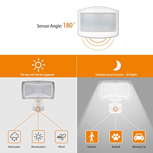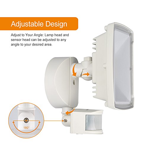 HIGH SENSITIVITY & ADJUSTABLE DESIGN: Up to 180°wide sensing angle and max 50ft sensing range. Easy to adjust the light heads, lens hoods and motion sensor to different angle as your requirement.