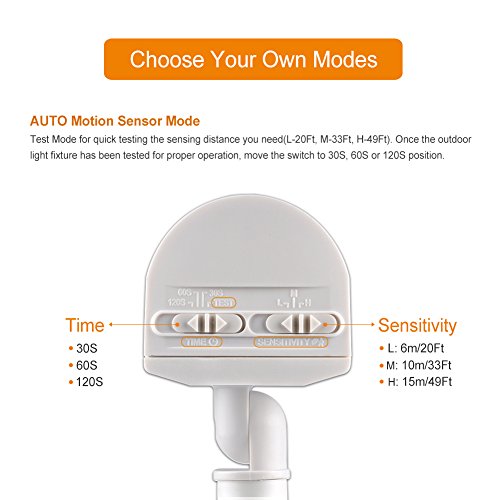 3 Convenient Operational Modes: Auto Mode: Auto-on when motion is detected and auto-off after 30 seconds to 2 minutes of preset time when no further motion has been detected.